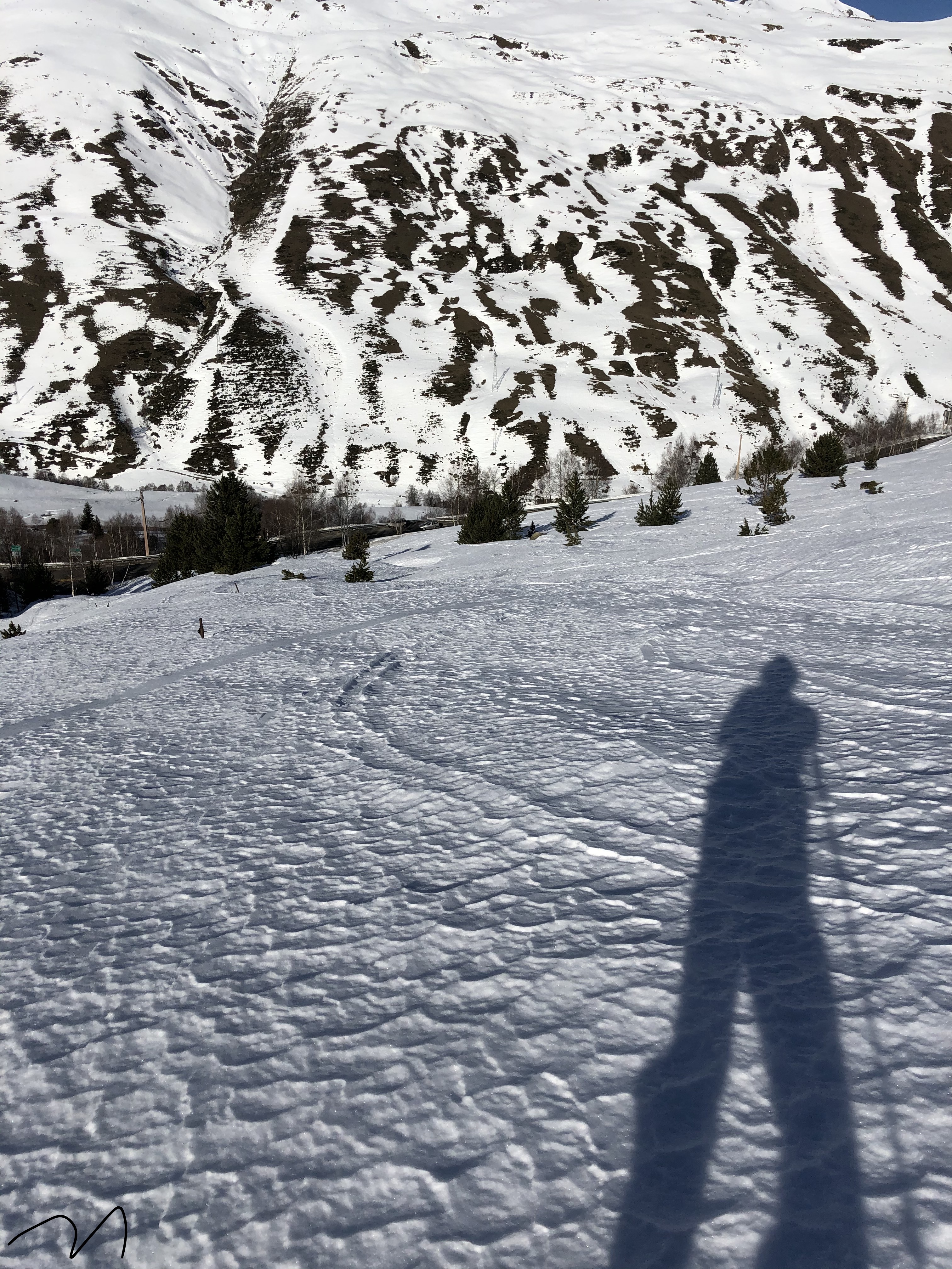 Pour le chemin du retour, je voulais absolument aller jusqu'au col du Puymorens, donc pas de traîne pour remonter le versant à peine descendu... puis celui de la mine dans lequel je me suis engagé en traversée parfois un peu raide depuis un peu plus haut pour aboutir bien au-dessus des bâtiments et n'avoir que peu à faire pour aboutir sur le promontoire de l'aller. Là, tout devient plus simple car on récupère une piste verte puis bleue de la station qui vous mène directement au col du Puymorens en 20 minutes. L'ensemble de cet itinéraire est assez proche du sentier estival qui lie les deux endroits. Mais comme je n'en avais pas assez et que surtout je voulais aller jeter un coup d'oeil aux restes du vieux téléski historique sur le versant ariégeois du col, j'ai poursuivi finalement, longeant la route pour ensuite remonter dans les arbres le long des vieux pylones. Voilà, j'ai à nouveau récupéré la piste descendue juste avant pour quelques centaines de mètres avant de basculer pour l'ultime descente alors que le soleil avait disparu derrière les lignes de crêtes andorranes du port d'Envalira.